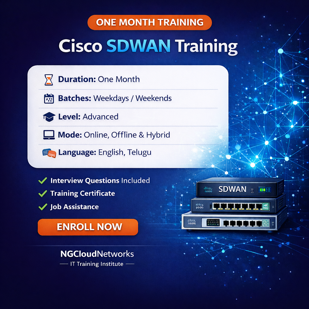 The training focuses on traffic engineering, policy configuration, application-aware routing, and centralized network management. It also includes hands-on labs to help you gain practical experience in real-world SD-WAN scenarios. Security concepts such as segmentation, VPNs, firewall integration, and secure connectivity are key parts of the curriculum.