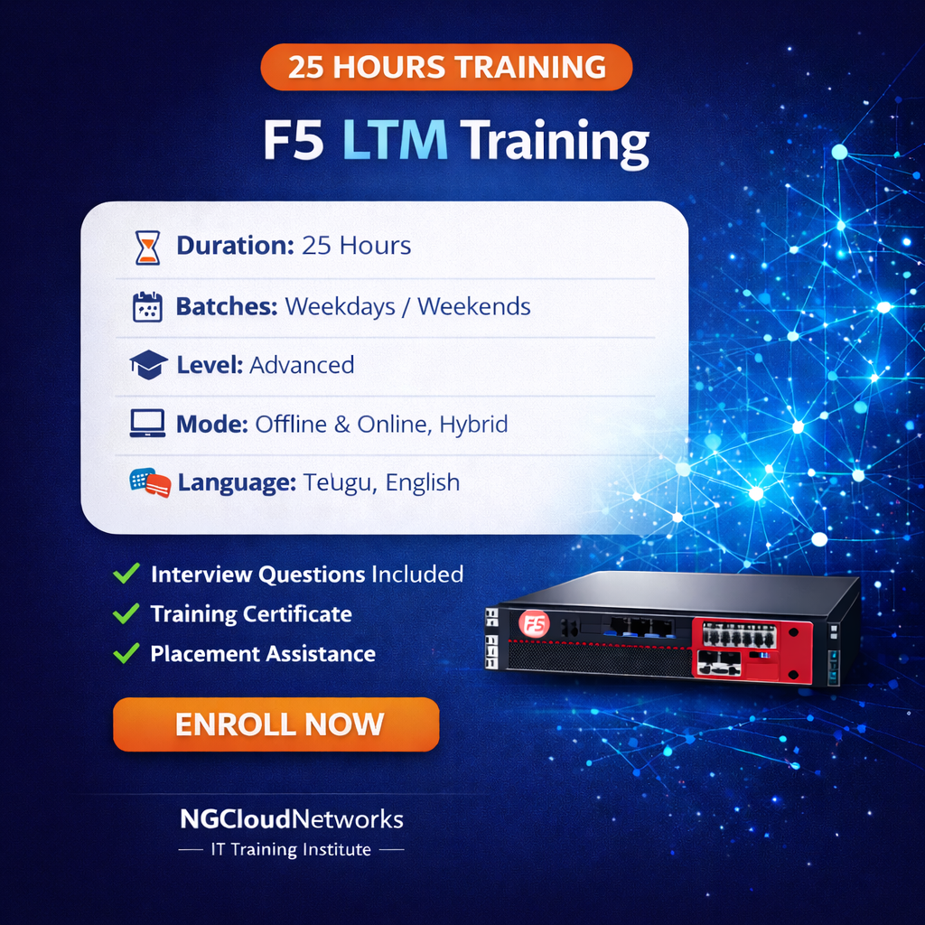 You will learn F5 LTM architecture, virtual servers, pools, nodes, profiles, and load balancing methods. The training also includes SSL offloading, health monitors, persistence techniques, and traffic optimization. Security basics such as access control and protecting applications from common threats are also covered.